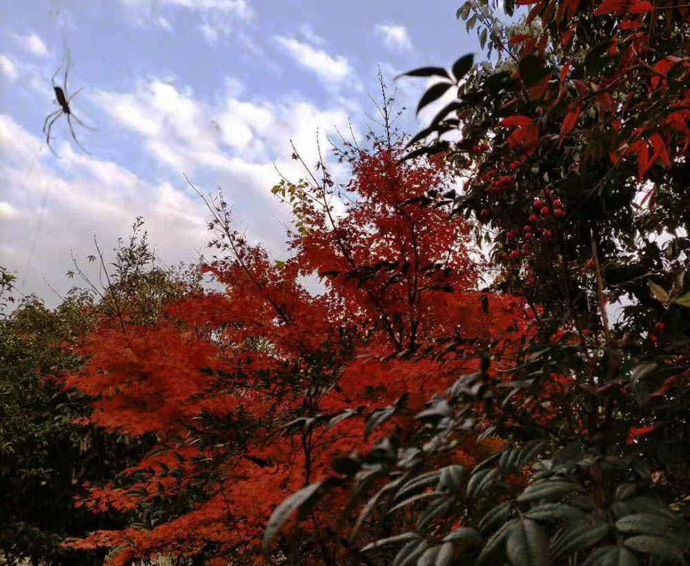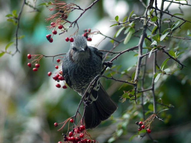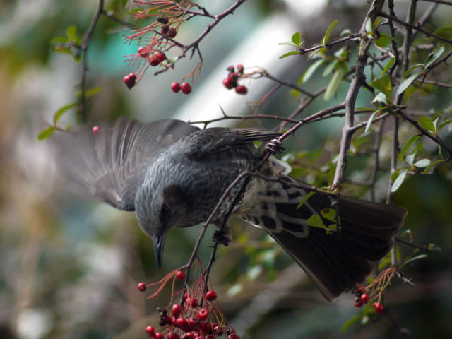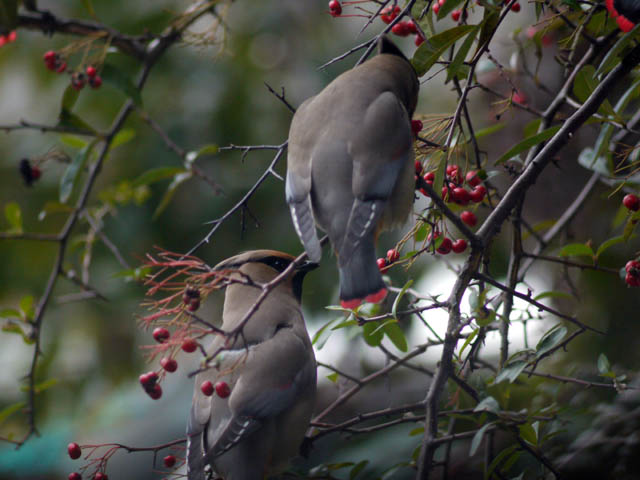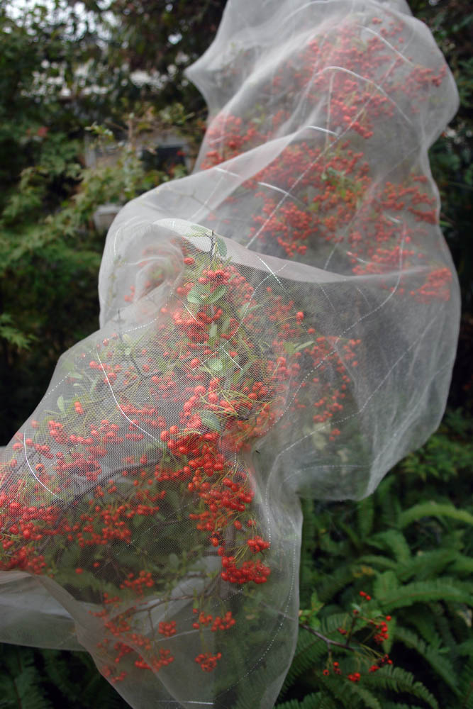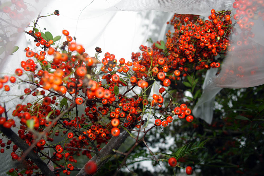いつもはあっという間に渡り鳥に食べられてしまうピラカンサスですが網で保護すると長期間綺麗に見る事ができますね (2014/11/2)